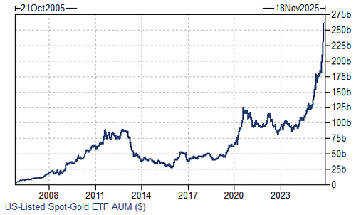 但别担心:就像两周前创纪录的杠杆加密货币崩盘一样,高盛的观点是,金价越高,没有投资(但想要投资)的人群就越广泛 - 因此高盛预计在出现稳定的第一个迹象时就会看到资金流入(需要保持 4,000 美元/盎司)。