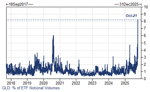 ETF 交易量:交易 ETF 以获得快速敞口的便利性已得到充分展示:截至今日收盘,GLD 占所有名义美国上市 ETF 交易量的 8%,在高盛的数据库中占据最大份额。ETF 交易台的资金流(不出所料)今日明显偏向于销售。
