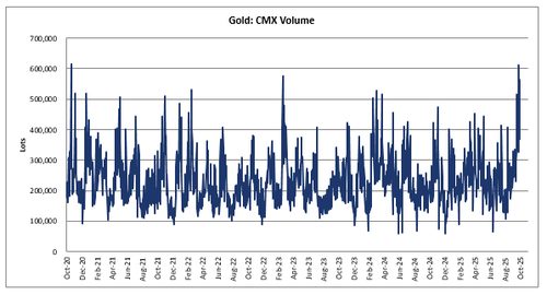 Comex 期货交易量:总交易量“仅”为 56.5 万手(撰写本文时并非年初至今的最高水平),而 MTD 预测交易量为 37.5 万手(因为仓位位于 ETF 内)